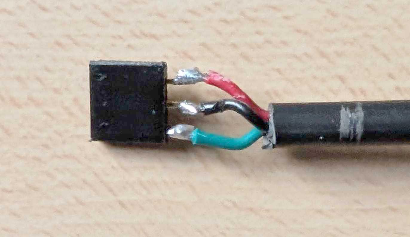 Im Internet wird der Sensor oft mit 5 V Betriebsspannung beworben. Hier dürft ihr euch nicht verwirren lassen: Ja, man kann ihn mit 5,0 V betreiben, aber eben auch mit 3,3 V, wie in unserem Fall. Prinzipiell kann jeder die Zuleitung so weit kürzen, wie er mag – oder auch gar nicht. Da die Leitungen relativ dick sind und kaum nennenswerter Strom fließt, wird eine Verlängerung sehr wahrscheinlich auch funktionieren. Ausprobiert habe ich das allerdings noch nicht.