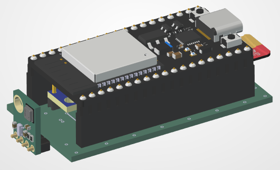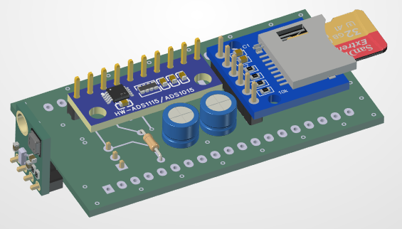 Unter dem ESP32 sieht es dann so aus: Auf der rechten Seite ist das SD-Card-Modul für eine Micro-SD-Karte zu sehen, und links daneben sitzt ein 12-Bit-AD-Wandler. Er misst die Spannung, die vom Drucksensor kommt, und berechnet daraus den aktuellen Druck. Obwohl der ESP32 schon eingebaute AD-Wandler mitbringt, habe ich mich für eine externe Lösung entschieden. Die Gründe werde ich später noch erläutern. Neben den Modulen müssen noch zwei Kondensatoren und ein Widerstand verlötet werden. Details dazu gibt es später im Kapitel „Aufbau“.
