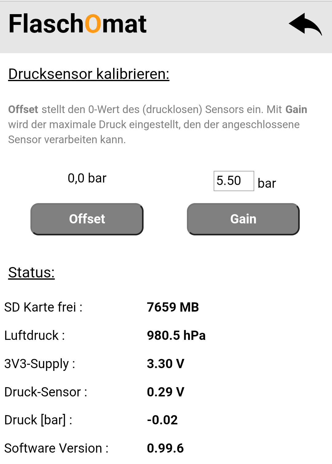Um k zu berechnen, wird der maximale Druck, den der Sensor verarbeiten kann, in das Eingabefeld eingetragen und dann der Button [Gain] angetippt. Unser Sensor kann 5,50 bar (80 psi) verarbeiten. Danach wird noch der Offset durch Tippen auf [Offset] ermittelt. Bei der Kalibrierung des Offsets muss der Sensor drucklos sein. Damit wäre eine einfache Kalibrierung auch schon abgeschlossen.