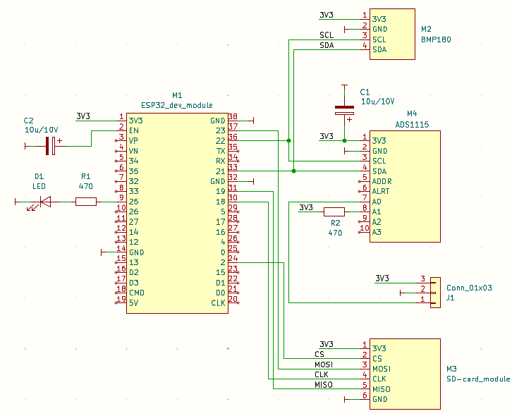 An den enstsprechenden externen Schnittstellen des ESP kann direkt die Peripherie angeschlossen werden. Die SD Karte hängt am SPI Bus (4MHz Takt), der BMP180 und der ADS1015 werden per I2C mit 100kHz angesteuert. ESP32 dev modul hat zwar eine "eingebaute" von der Software ansteuerbare LED, trotzdem wurde eine weitere LED am GPIO25 vorgesehen (D1). Das um den Nachbauern die Möglichkeit zu geben auf andere, ähnliche ESP32 Module auszuweichen die ggf. keine LED an Bord haben.