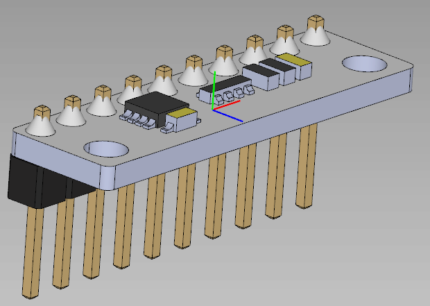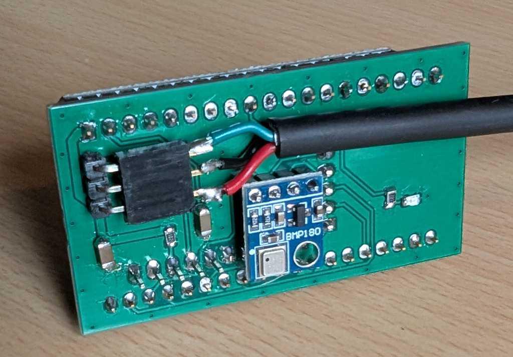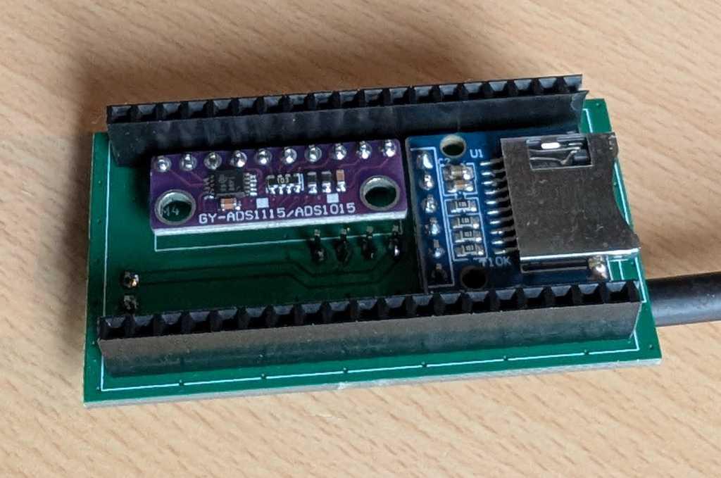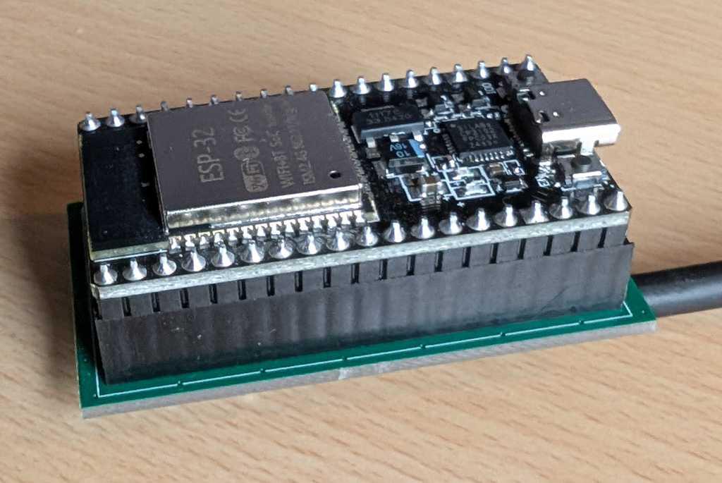 Die Module sind in mehreren Ebenen übereinander aufgebaut. Wie schon erwähnt ist alles im Handel leicht bestellbar. Eine Liste mit den genauen Bezeichnungen folgt weiter unten. Zu sehen ist hier das Herzstück des Flaschomat, ein ESP32 modul. Er enthält den Prozessor, integrierten Flash und RAM, das WLAN modul und einen USB Anschluß. Das ESP32 modul sitzt auf Pfostenleisten, um darunter PLatz für weitere Modul zu schaffen.